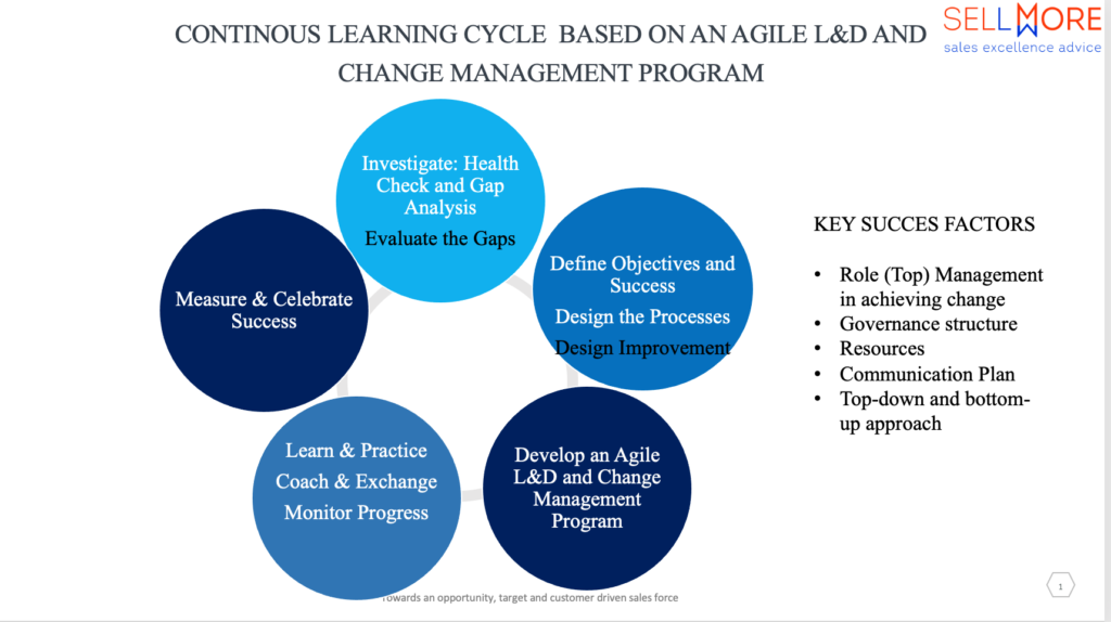 - Important to focus on embedding the change in the organisation, ‘make it stick’. A lot of examples on how to do this have been given. What works well in large/global organisations is the creation of ‘Implementation Coaches’ who participate in team meetings, join sales reps/account managers to customers and identify needs for further development for both the sales teams and leaders. Or coaches who coach your sales leaders on improving their leadership capabilities. Capabilities which were defined as key succes factor for successful commercial and digital transformations/changes. And as mentioned in previous blogs, it all contributes to create a continuous learning environment: